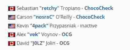 retchy、nosraC这两名目前效力ChocoCheck和他们的前队友4pack一起被禁赛,OCG成员vek和J0LZ也同样被禁赛。这五名选手涉嫌“违规参与博彩”被禁止参加ESEA的比赛直到5月3日。