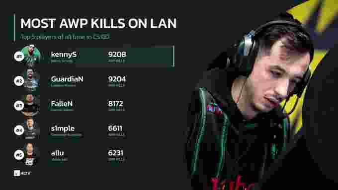 日前HLTV发布统计数据,kennyS已经成为线下赛事最多AWP击杀的选手,击杀数达到了9208人,而GuardiaN紧随其后为9204人。最后一舞FalleN位列第三,为8172人。