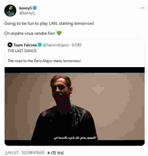 随着BLAST巴黎Major欧洲区RMR赛事的到来,Falcons全队也是上下一心,赛前,Falcons在推特发布了出征短片《The last dance》(最后一舞),表现出了法国人将为本次Major放手一搏的心态。而后kennyS转发并评论了本条推特,在转发的同时,kennyS用法语对支持他们的粉丝表示:“我们希望让你感到骄傲!”