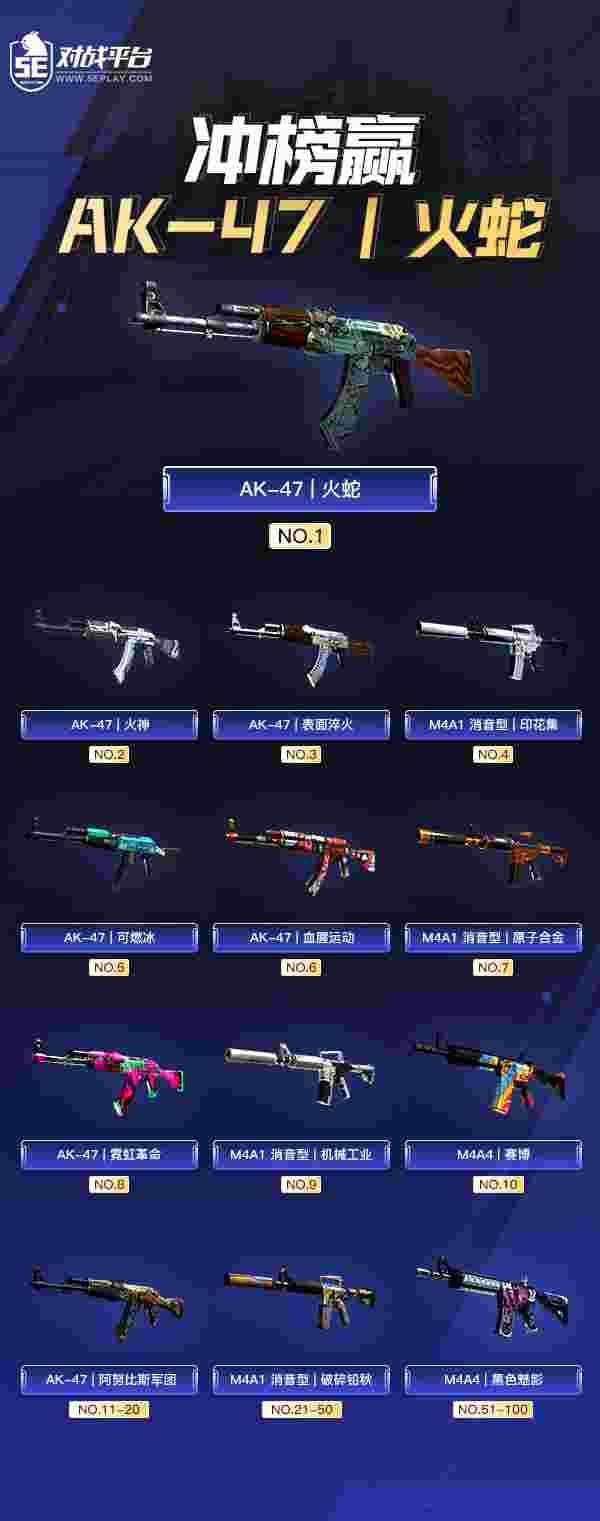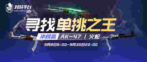 战绩统计时间:9月1日08:00—9月30日22:00,完成天梯1V1模式中的长枪1V1即可冲击单挑之王排行榜,榜单前一百名均可赢取饰品奖励,第一名更可获得AK-47 | 火蛇!