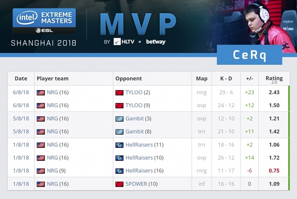 在IEM上海站中,CeRq的平均Rating为1.34,位列所有参赛选手之首。并且在决赛对阵TyLoo时,CeRq的表现更是出众,Rating达到1.87,KDD为+35。除此之外他的其他数据也是名列前茅,比如最高KDD达到+58,平均每回合击杀数0.83,AWP每回合击杀0.45排名第3以及开局首杀率64.5%排名第4。综合所有数据被HLTV和betway评为IEM上海站MVP。