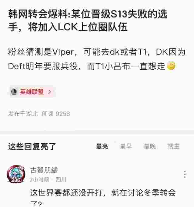 就在最近,韩网有人爆料了一个消息,没能够进入到S13世界赛的顶级选手,要加入到lck赛区上位圈的队伍了。说实话,能够被称作是lck赛区上位圈的队伍真的太少了,gen战队和T1战队应该是一之无愧的,Dk战队目前的成绩和荣耀也可以在这个圈子中生存。大量的粉丝也是纷纷猜测很有可能是AD选手viper,毕竟它的热度和知名度还是非常高的,在h le战队也打出了不错的操作,但是没能够晋级到世界赛。