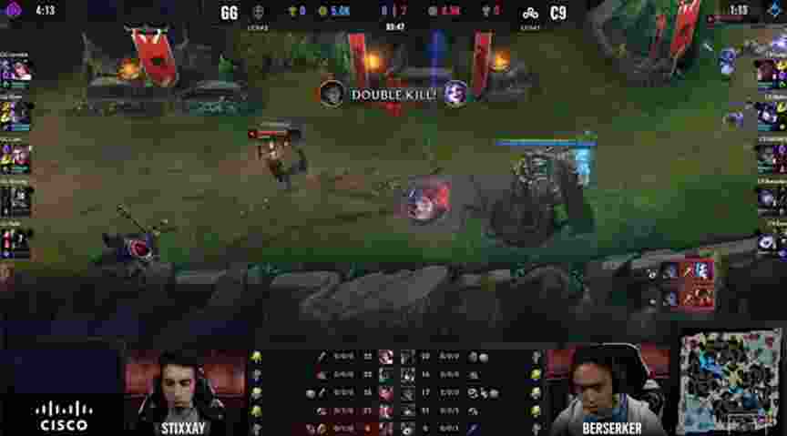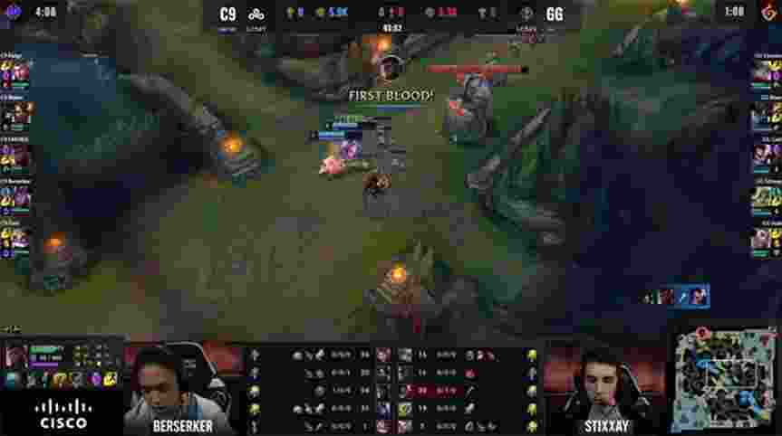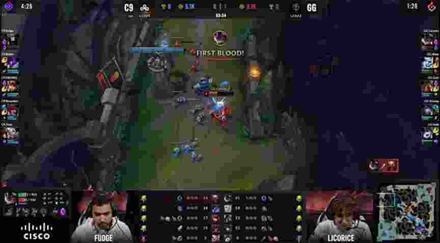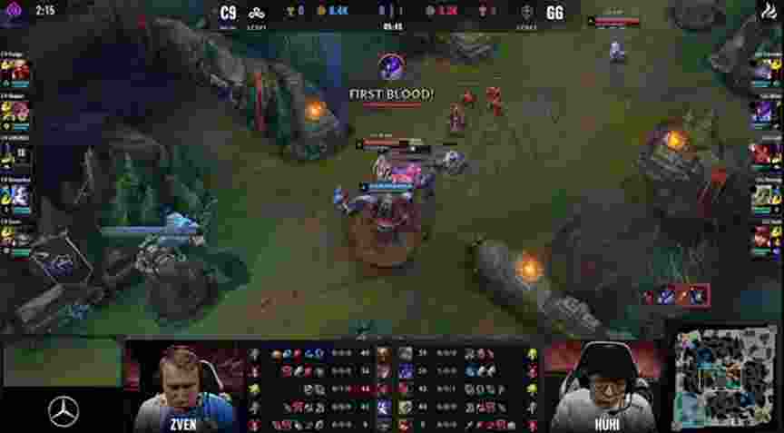 虽然大树预判到豹女对于下路的越塔gank攻势,但Blaber的征服者豹女跟队友的换扛塔配合完美,C9三打三打出0换3梦幻起飞,GG中野连带下路彻底崩盘,这导致6级的大发明家在GG蓝buff野区单杀了只有5级的大树。豹女控图节奏拉满,无压力收下火龙加峡谷先锋。GG尝试抱团抓单止损,在小龙河道四打三才打出3换3,韦鲁斯在混战中单杀了泽丽,稳稳地单吃了GG下路一血塔。13分钟C9放出先锋推掉中路一塔,奎桑提吃满了GG的第一波伤害锁血不死,C9还反打出0换2,滚起了8千多的经济雪球。