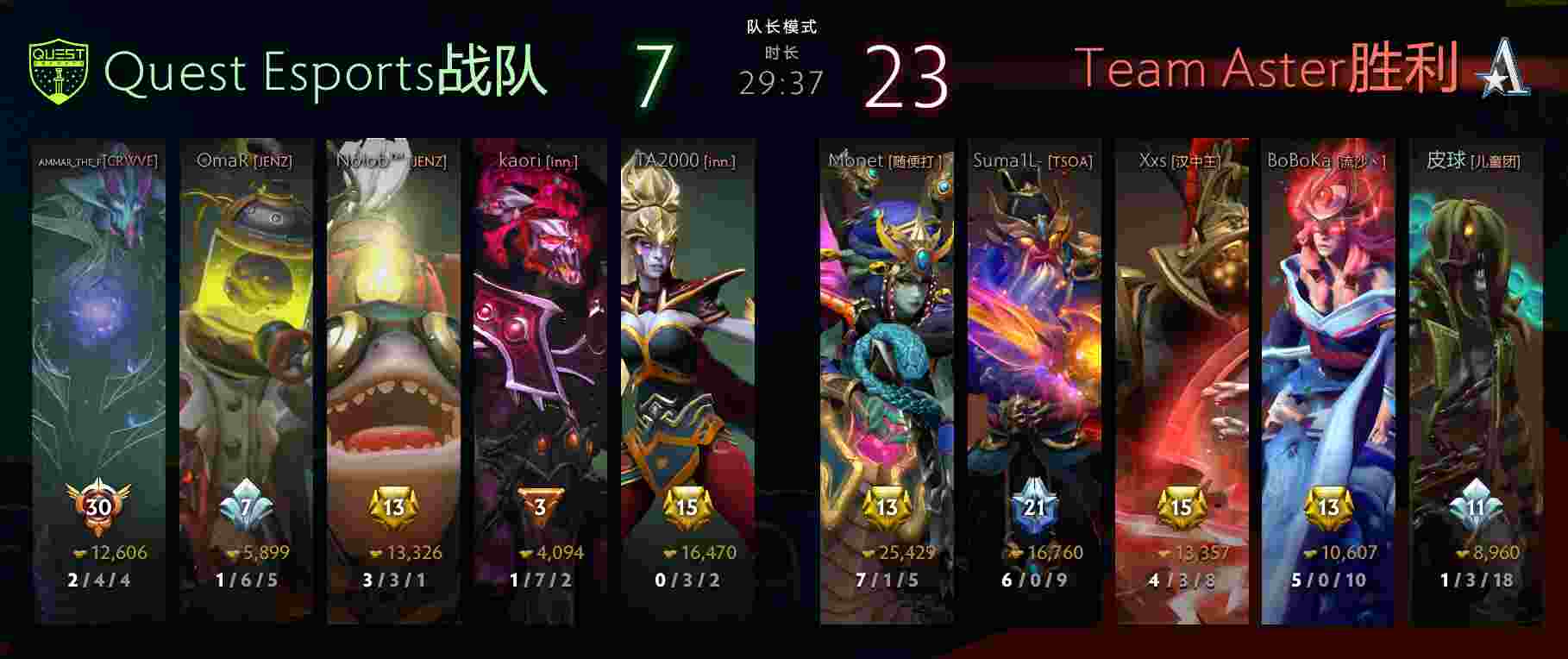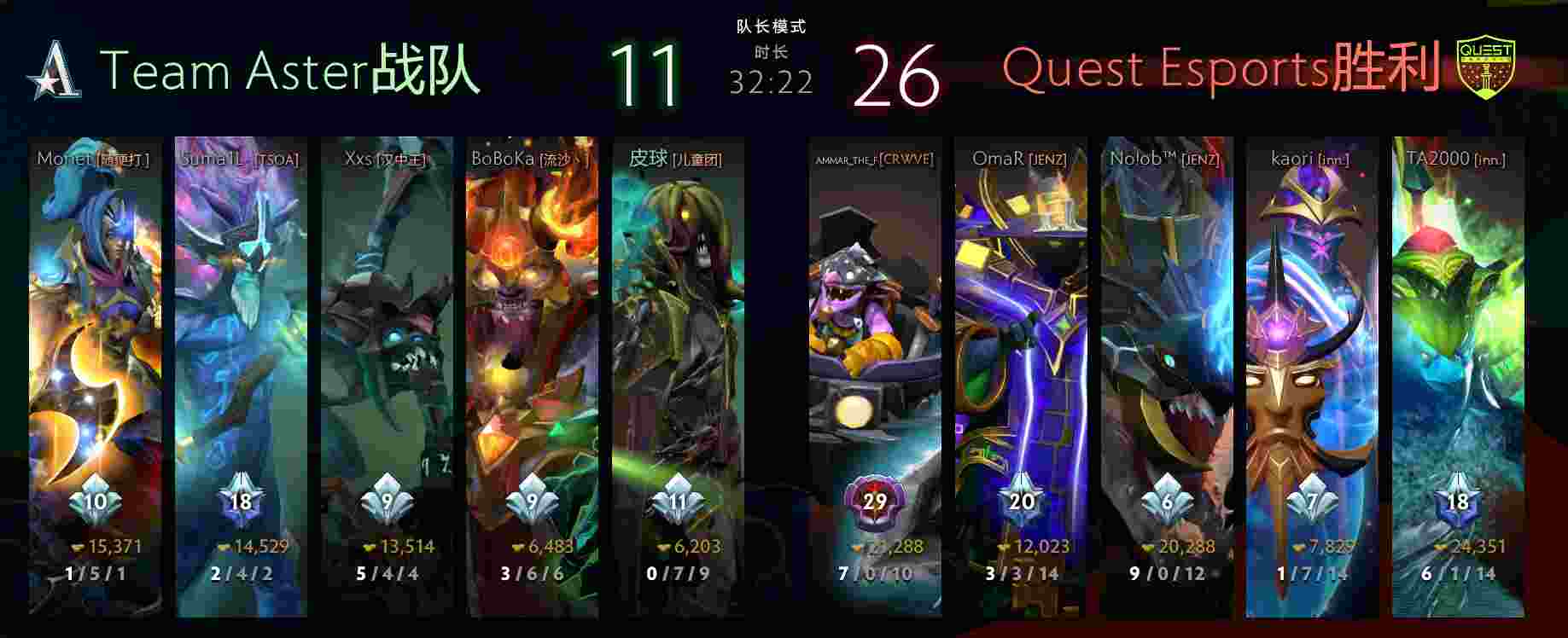 而第三场,只能说是一场跌宕起伏的比赛,Aster的阵容是一号位血魔,中单拉希克,三号位是潮汐猎人,四号位小精灵,五号位蝙蝠。这是一套很明显的打线优,中期压制结束比赛的阵容,优点是前期战斗力强终结比赛快,弱点就是抓人能力弱,对方如果足够灵活开始带线就十分无力,只能依靠蝙蝠的跳刀抓人。而Quest这把是,一号位美杜莎,中单帕克,三号位小鱼人,四号位炸弹人,五号位尸王。这一套阵容,明显就是一套中期避战带线,为美杜莎拉扯空间后期统治比赛的阵容。首先看到Aster的阵容我们就要想起输掉第一场结束时的话了,Aster真的不适合需要前中期就终结比赛的阵容。