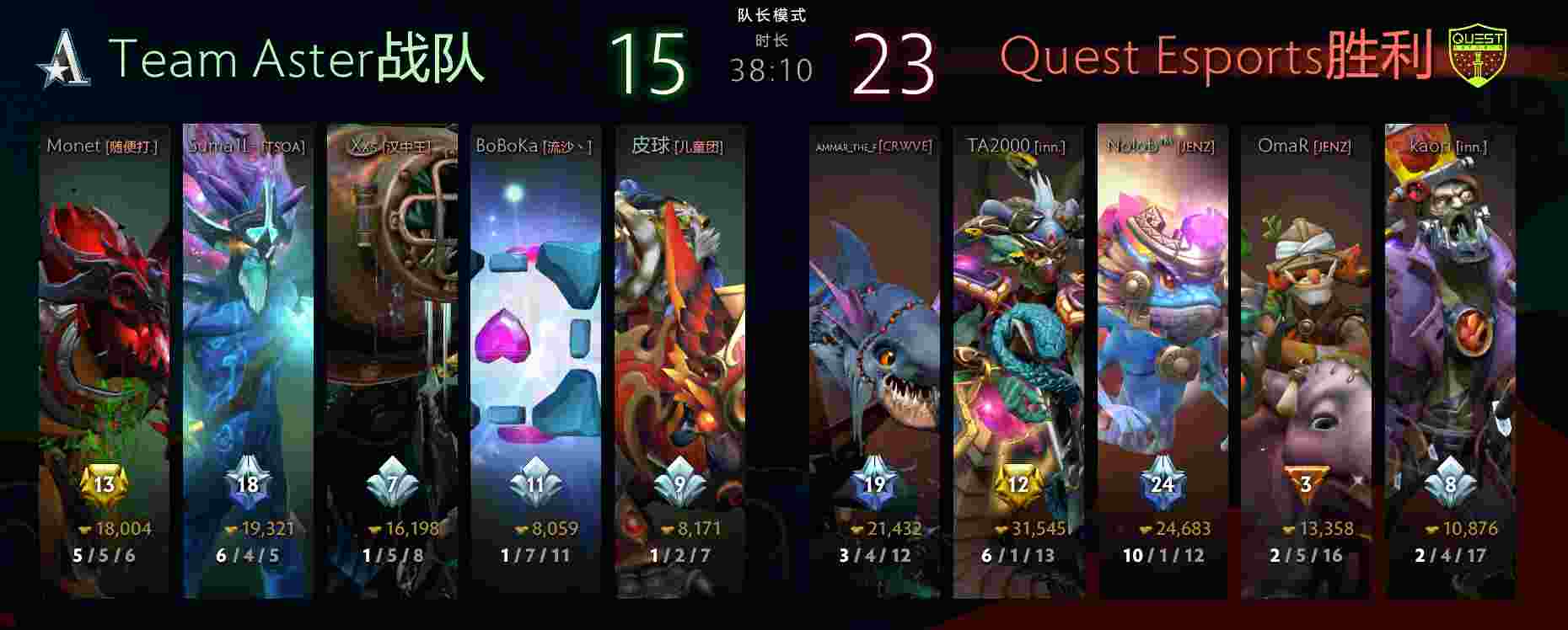 个人觉得Aster目前一定要选一些后期稳吃对面的阵容,对方有美杜莎,Aster起码要有水人或者敌法师。只有这样Aster才能真正打好自己的节奏,而Sumail目前的状态可以说是神勇,今天的三场比赛对线都是完爆了Quest的中单Noob,Xxs的对线能力也在回归,Monet只要英雄不太劣势也能保证自己的发育,LGD是太过于注重后期导致对线直接结束,而Aster在己方选手有能力打好对线的情况下,却总是将自己的短板暴露给对面,那就是中期压制力不足,无法终结比赛,只要后期比你强就有很大概率翻盘。希望Aster能够调整一下阵容思路,Aster需要的不是前中期结束比赛,而是用自己依靠自己对线的实力,用后期能力强的阵容稳住对线,又能拖到后期获胜!