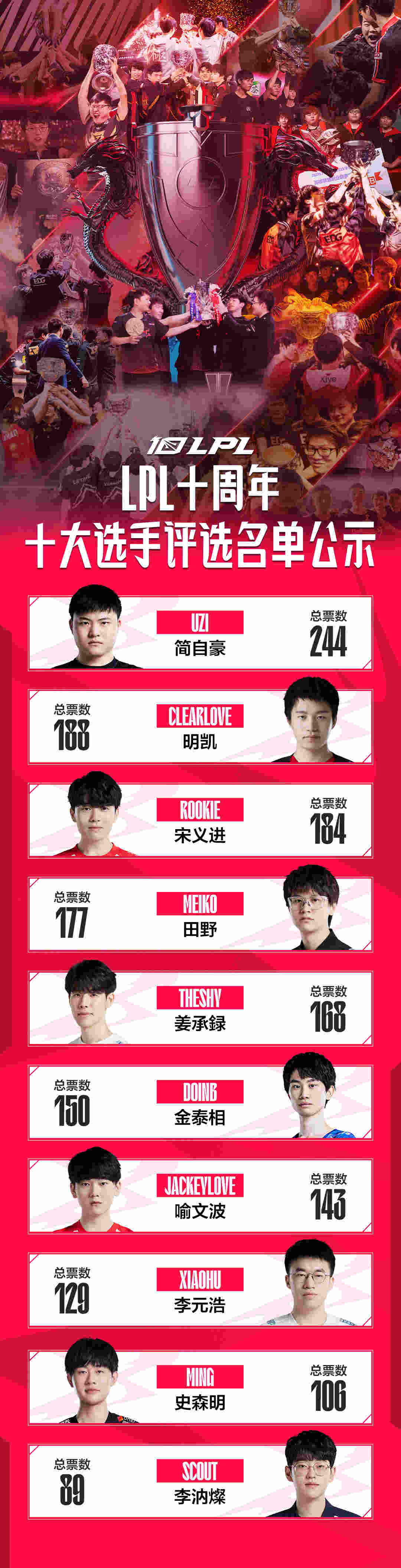 北京时间3月22日,LPL十周年的票选十大选手活动已经结束,今日英雄联盟官方对投票结果进行公示。十大选手候选人分别为:Uzi、Clearlove、Rookie、Meiko、TheShy、Doinb、JackeyLove、xiaohu、Ming、Scout。