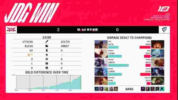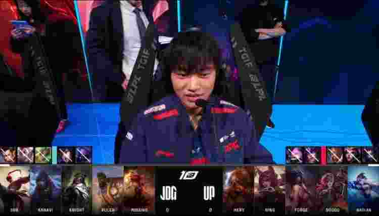 2023LPL春季赛常规赛第十周第六日,JDG战队与UP战队迎来他们的常规赛收官战,相比于早早无缘季后赛的UP战队,JDG战队本场比赛的战果决定了他们能否夺得常规赛头名乃至季后赛复活甲,面对原本硬实力就弱于自己很多的对手,JDG没有丝毫想要手下留情的理由,通过凌厉的前期攻势迅速扩大差距,两局摧枯拉朽的碾压2-0击败了UP,锁定常规赛第一。