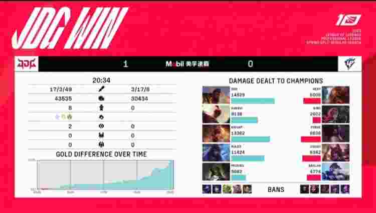 UP队员复活以后赶到中路与JDG争夺上半区视野,蔚直接闪现先手厄斐琉斯结果深入JDG包围圈不幸阵亡,JDG顺势在中路放出先锋展开推进,烈娜塔Q中阿卡丽将其秒掉,UP中门大开防线完全崩溃,JDG长驱直入一路平推,悉数瓦解掉了UP的抵抗,在20分钟出头就结束了第一局比赛,1-0强势领先!