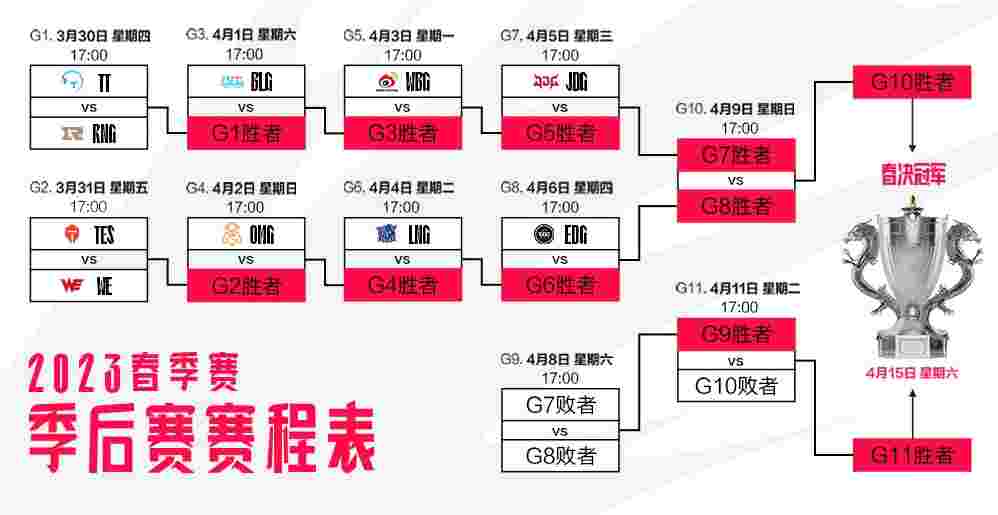 2023LPL春季赛常规赛已经结束,在经历了十周赛事的激烈争夺后,JDG、EDG、LNG、WBG、BLG、OMG、TES、TT、RNG以及WE共十支队伍成功打入了季后赛。而在2023年3月30日这一天,LPL春季赛将开启季后赛新的征程,这十支队伍将向春季赛冠军以及MSI资格发起新的挑战。