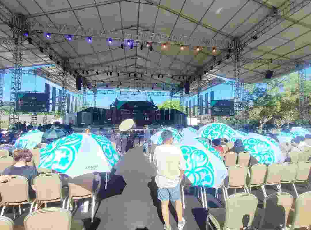 经过了连日暴雨之后,巴厘岛终于恢复了久违的晴天。主办方为现场观众准备的农贸市场简易大棚观赛体验直接拉满。一半屏幕实时演绎,一半屏幕让现场观众猜现场局势。讲道理,花了388美元和888美元现场观赛的观众应该对DOTA2都是有自己理解的吧,虽然一半屏幕看不到,但是局势你们心中应该是了然于胸。
