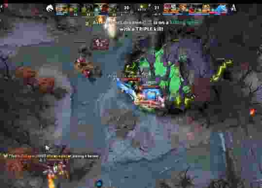 12分钟,控符时间,紫猫被斧王吼先手,风行者接双捆输出,冰女跟大招,紫猫一丝血跨地形跳走仍被斧王战争饥渴收下人头。