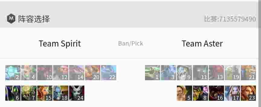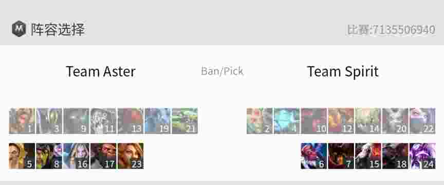 对线分路:Spirit在天辉方,Aster在夜魇方。上路Mira拉比克、Collapse孽主对Monet炼金、皮球冰女,中路Larl痛苦女王对Suma1L风行者,下路Yatoro幻影长矛手、Miposhka小鹿对boboka光法、xxs末日。