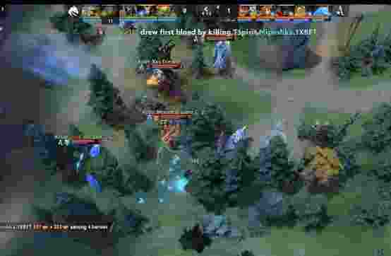 4分钟,冰女走开一会儿,末日马上联合天涯墨客冲塔击杀炼金,末日获得一血。冰女回来技能连发,击杀末日,天涯墨客树林里甩出一笔带走冰女。同时中路风行者在光法帮助下击杀紫猫,双方并没有拉开明显经济差距。