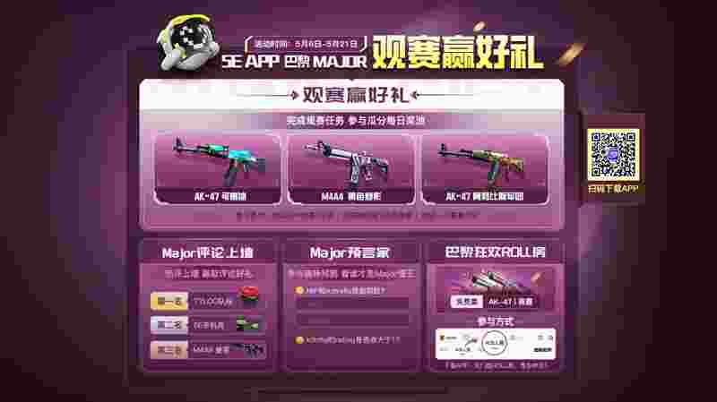 MAJOR观赛有礼,看比赛赢千元饰品好礼!5月8日-5月21日,前往合作平台观看MAJOR赛事并完成指定观赛任务获取奖品CDK。登录5E对战平台或5EPlay APP(仅限安卓)兑换CDK,最高可得折叠刀(★) | 传说!