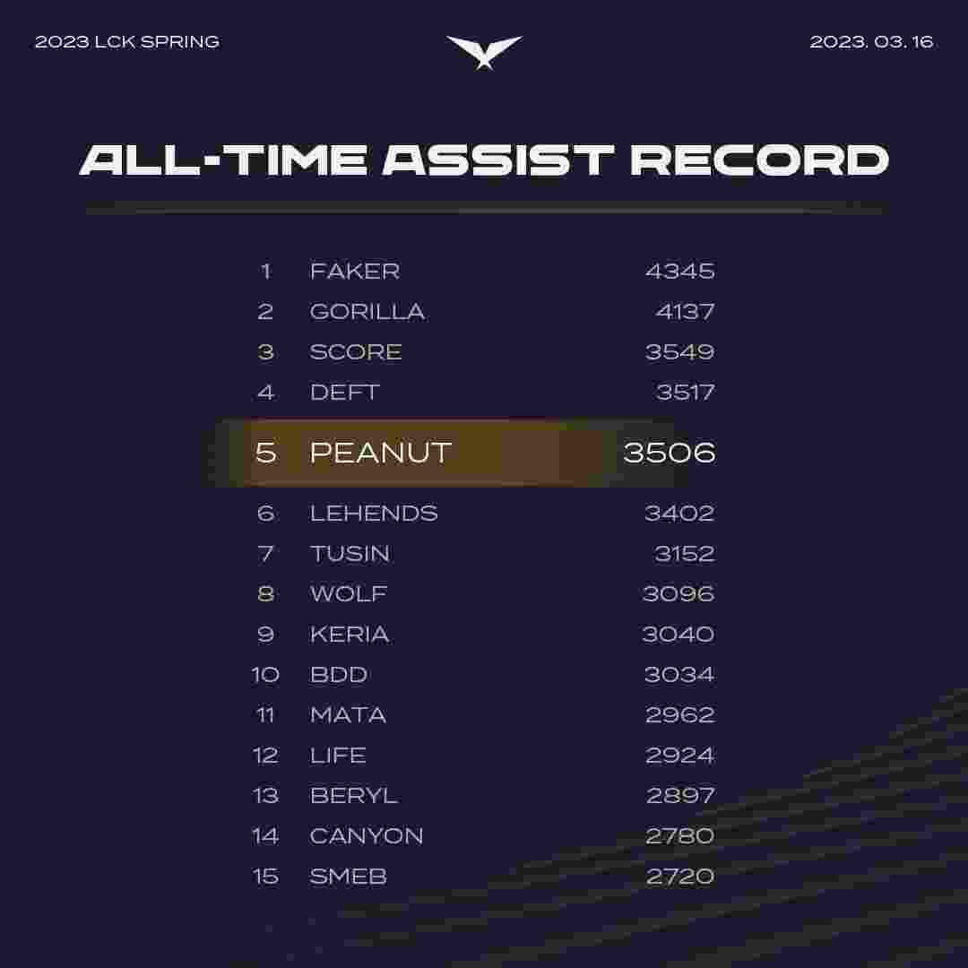 目前Peanut在助攻榜但上排名第五,排在他前面的由Faker、Deft等LCK知名选手。