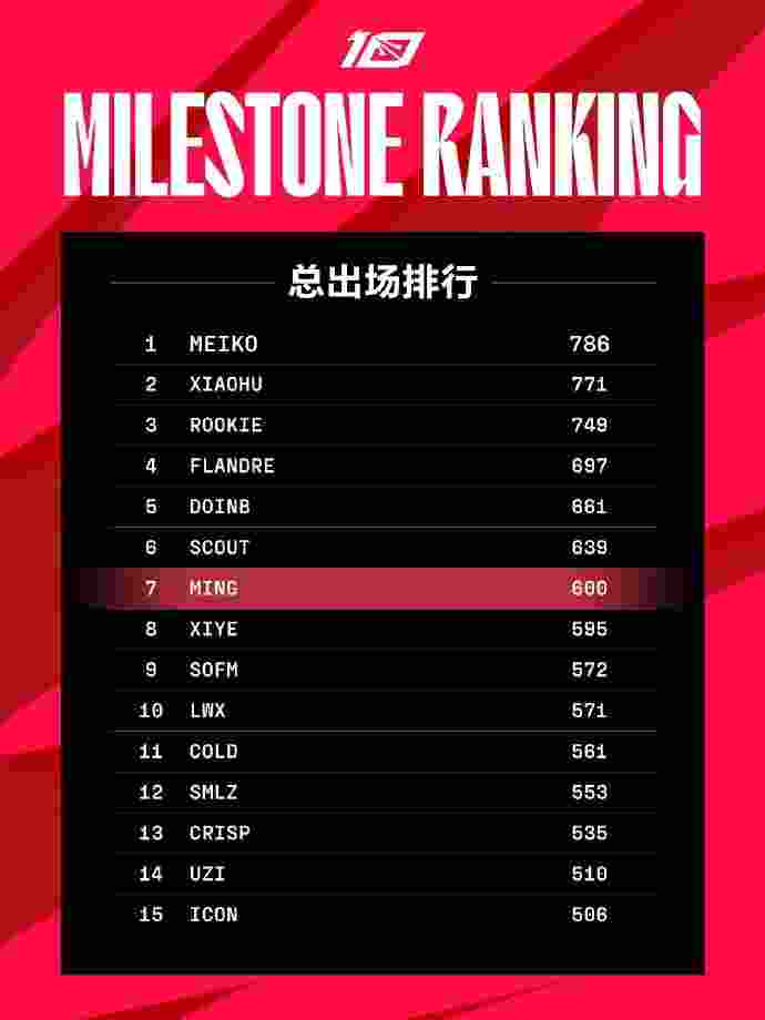 Ming是LPL第7位达成此成就选手,目前登场数600,胜场数372,总击杀500,总助攻5439。