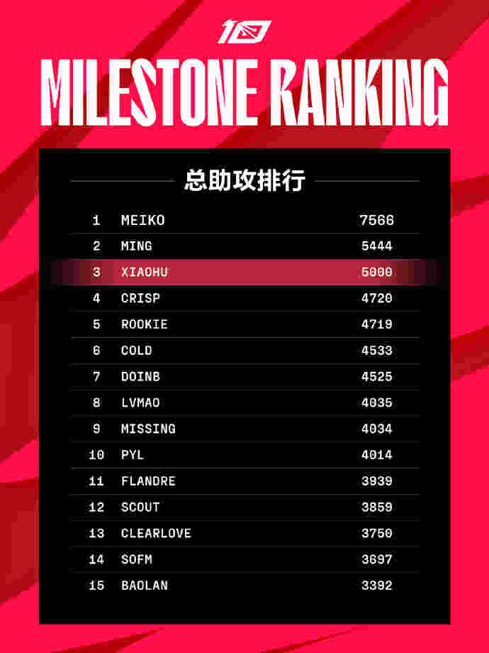 Xiaohu也是LPL第三位达成此成就选手,排名在他前面的有Meiko和Ming。