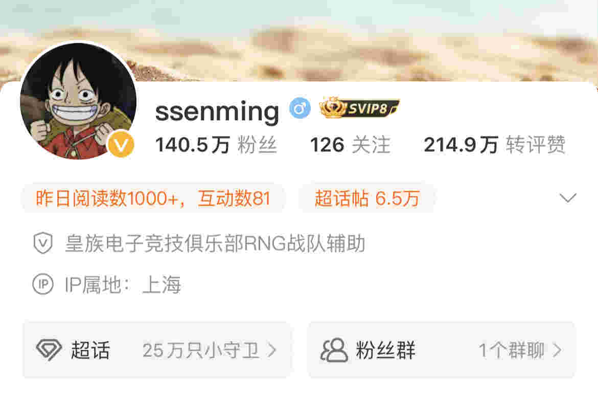 今日原RNG功勋辅助MING微博资料更新,名字前缀RNG被删除,微博改名为ssenming。但微博认证还没有更改,目前依然是“皇族电子竞技俱乐部RNG战队辅助”,估计认证更新需要审核,没法和名字一样第一时间改掉。
