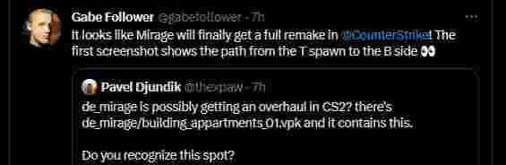“各种迹象表明,CS2的开发者正在准备全面重制Mirage!第一张截图显示了从匪家到B区的道路。”