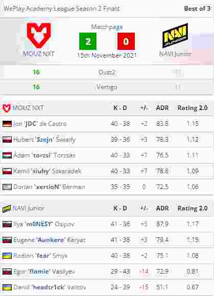 决赛中mouz NXT先在Dust2上展现了自己出色的CT防守,也正是他们优秀的防守让NaVi Junior后面追分逐渐困难,最终16-11拿下图一。Vertigo几乎也是同样的剧情,尽管m0NESY尽力帮助队伍,但是NaVi Junior还是没能完成翻盘,最终mouz NXT以16-11拿下图二最终获得了总冠军。