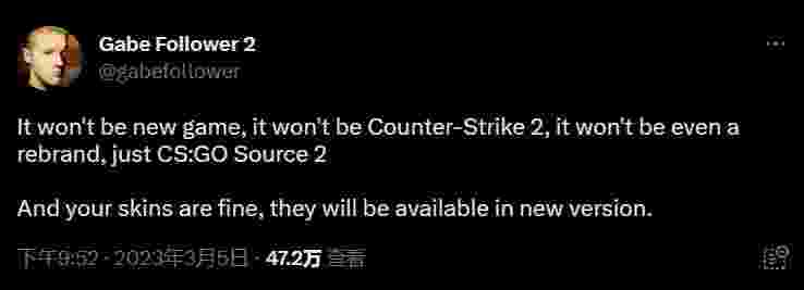日前知名社区大咖Gabe Follower在个人推特上说明了可能即将到来的CSGO新版本,他表示这一次的更新里,只是会给CSGO搭载起源2引擎,并非什么全新的CS游戏。