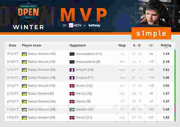 S1mple同样因为自己的精彩发挥,而获得了本次HLTV.org的MVP奖章。他高达1.52的Rating名列第一,52次首杀、6次赢下残局、0.41的AWP击杀也获得本次线下赛事多项之最。