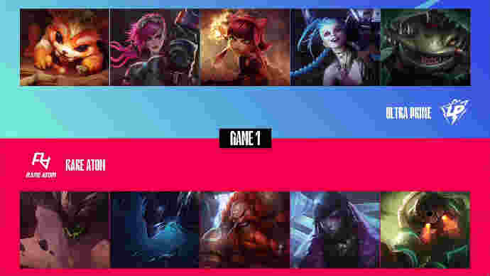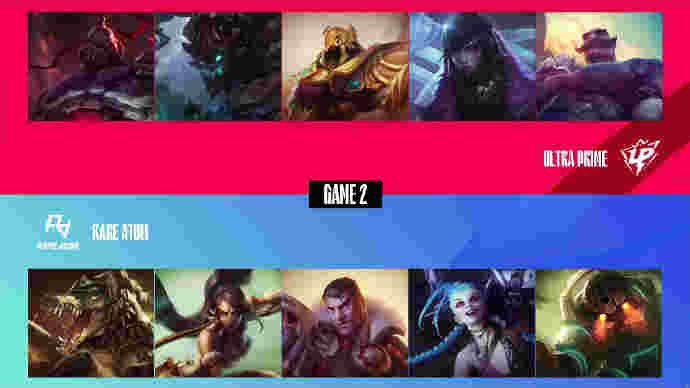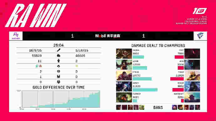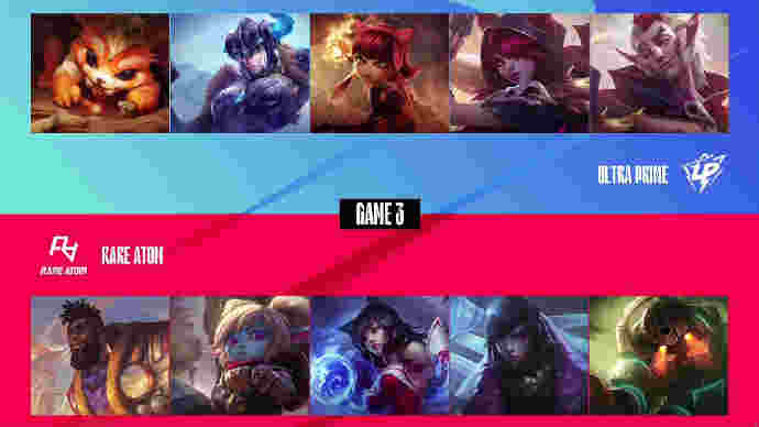 中期,第23分钟,茂凯河道闪现W豹女被豹女闪现躲开,正面金克丝击杀沙皇启动再杀茂凯,布隆送金克丝三杀,RA打出0换3拆掉UP两路撤退收掉大龙,经济领先1w3k。2分钟后,RA下路推进拔掉UP二塔,茂凯高地开R劝退,RA拉扯后持续施压,中上兵线大军压境,RA轻松冲上UP高地开始游泳,一波推平UP基地扳回一城。