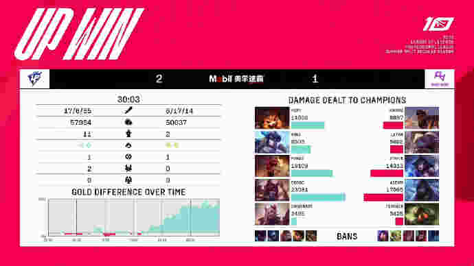 比赛第7分钟,UP下路三人越二,洛抬起厄斐琉斯,霞跟上输出拿到积分,残血泰坦塔下也没法走掉,霞拿到二连击破。然后UP收掉第一条小龙。波比走过来留人壁咚洛打出其闪现,泰坦钩到霞波比跟上收掉终结人头,厄斐琉斯下路红白刀爽吃塔皮。