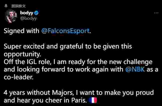 近期法国战队的阵容变更都是为了迎接法国CSGO的盛事——BLAST 巴黎Major。bodyy在官宣自己加入Falcons的推特中激动写道:非常兴奋能获得这个机会···已经四年没有参加Major了。我想让你们为我骄傲,在巴黎听到你们的欢呼声!而shox组建的新队伍也把目标放在了晋级巴黎Major上。