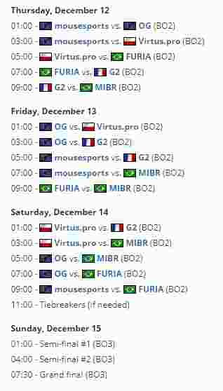 与上次比赛一样,本次S5的小组赛也将采用BO2循环赛制,每赢下一张地图就可以拿到1500美元的奖金。最终,排名前四的战队将会晋级到BO3的单败淘汰赛中。本次巅峰联赛S5将于12月12-15日举办,届时队伍对阵如下。