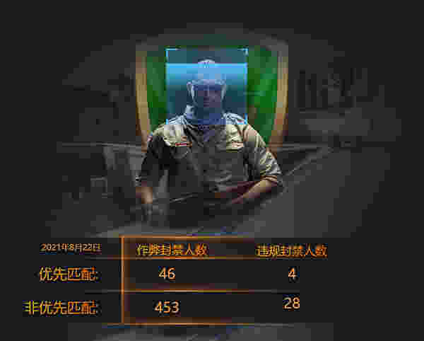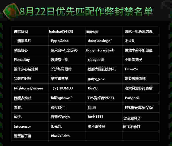 在8月22日的封禁名单中,总共46名优先匹配玩家被作弊封禁。这46名作弊封禁玩家的人脸信息也将无法完成人脸识别再次进入优先匹配或注册任何5E平台账号,更不可能参加由5E平台所主办的任何赛事。