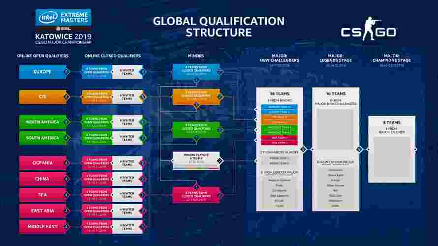 所有Minor都将会在卡托维兹的ESL体育馆进行,本次将会有每两个地区同步进行的情况。欧洲区和独联体赛区Minor将于1月16日至20日期间进行,亚洲区和美洲区Minor将在1月22日至26日进行。每个赛区Minor的前两名可以直接晋级2月13日开始的Major新挑战者组阶段,而Minor的第三名则会进入一个与其他三个赛区的第三名组成的淘汰赛,争夺最后两个Major名额。