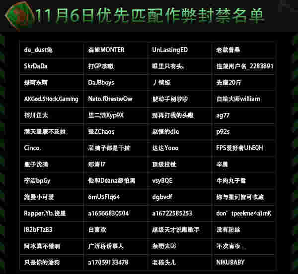 在11月6日的封禁名单中,总共56名优先匹配玩家被作弊封禁。这56名作弊封禁玩家的人脸信息也将无法完成人脸识别再次进入优先匹配或注册任何5E平台账号,更不可能参加由5E平台所主办的任何赛事。