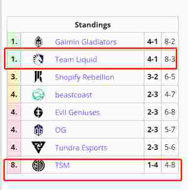前五日的比赛过后,Liquid以8-3的小比分与GG并列第一,证明了自己TI季军major亚军的含金量,提前锁定了下一轮的比赛,而TSM战队则是相反,这次输掉的话,则是提前锁定了回家的机票