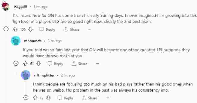 “这太疯狂了,ON和他在SNG时期相比已经成长了这么多,我从来没有想象过他能成长成如此高水平的选手。BLG现在真的很强,显然是JDG以外第二好的队伍。”