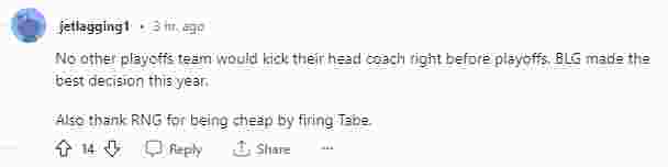 “没有其他季后赛队伍会在季后赛开始之前会踢掉自己的主教练,但BLG做了,而且这是他们这一年做过最好的决定。另外还要感谢RNG把TABE便宜处理了。”