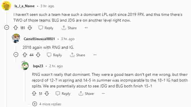 “自2019年的FPX以来,我从未见过有这样一支队伍能在LPL中如此主宰,而这次同时出现了两支这样的队伍,BLG和JDG完全在另外一个次元。”