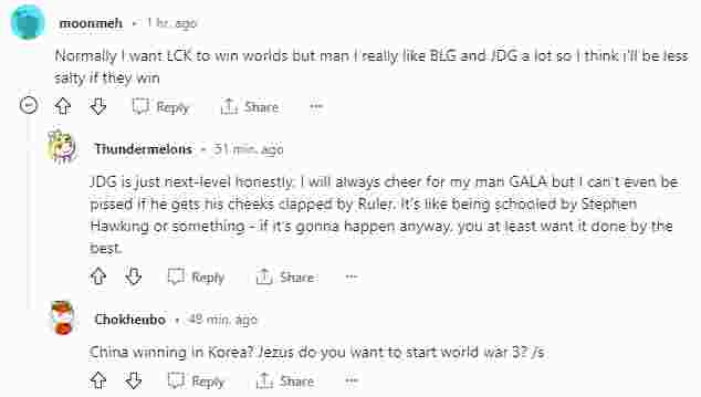 “JDG说实话已经是另一个次元的队伍了。我永远会为了我的男人GALA欢呼,但是如果他在比赛里被RULER按着打,我甚至不会生气。这就像是你在学校里接受了史蒂芬霍金的教育——如果这一切无论如何都会发生,你至少希望对面是最强的那个人。”