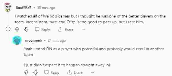 “我觉得ON在WBG的时候,人们总是抓着他的失误骂,而没有注意到他玩得好的地方。他再过去的问题始终只有稳定性这一点而以。”