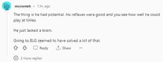 “问题是他很有潜力,他反应很快,你会看到他有时能打得非常好。他只是缺少一个脑袋。加入BLG似乎完全解决了这个问题。”