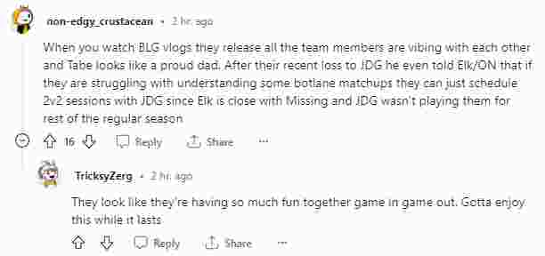 “当你看BLG的vlog时你会发现所有团队的成员都在互相交流,而TABE就像一个为他们感到自豪的老父亲。在他们之前输给JDG以后,TABE甚至告诉ELK和ON,如果他们在解决下路对线问题上遇到困难,他可以帮忙给他们约和JDG的2v2训练。因为ELK和MISSING关系非常好,而他们在剩下的常规赛里不会再遇到JDG了。”