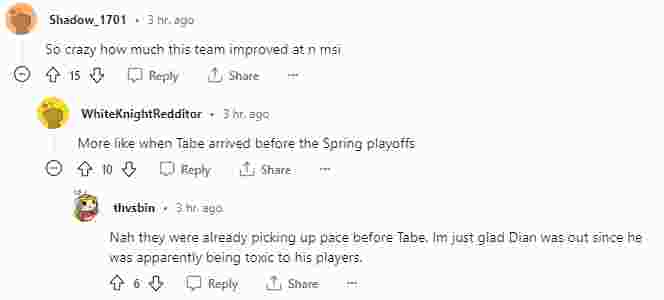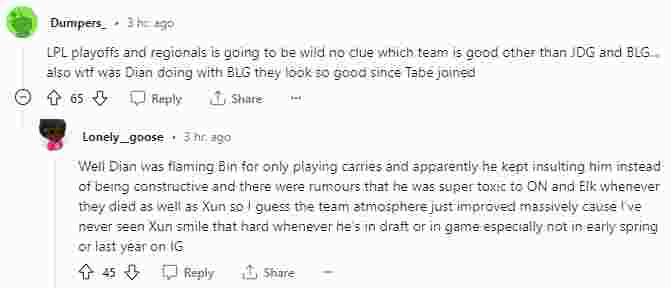 “DIAN因为BIN只玩CARRY型的英雄而经常责备他,显然他只给BIN带来了侮辱却没有建设性的意见。另外有传言说每当ON和ELK以及XUN死掉的时候,他都会非常严厉地责骂他们。所以我想TABE代替DIAN以后,团队的氛围大大地改善了,因为我从来没有见过XUN在bp阶段或比赛时笑得这么开心过,尤其是在春季赛早期以及他还在IG的那会儿。”