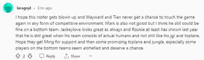 “我希望这个阵容赶紧毁灭吧,让TIAN和WAYWARD在任何形式的竞争环境里都没有机会再打比赛。MARK也不行,但我认为他在面对一支垫底的队伍时看上去仍然不错。JKL看上去一如既往的出色,而ROOKIE至少在去年已经证明了当他的上野是正常人的时候他也能表现得很好。希望他们能得到MING,然后得到一些有前途的上单和打野,尤其是一些垫底的队伍的选手看上去很优秀,他们应该得到前往强队的机会。”