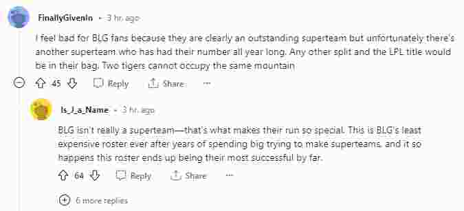 “我替BLG的粉丝感到可惜,因为BLG是一支非常出色的银河战舰,但是不幸的是有另一支银河战舰JDG能随意拿捏他们。不管是LPL冠军还是其他比赛,冠军都将是JDG的。一山不容二虎。”