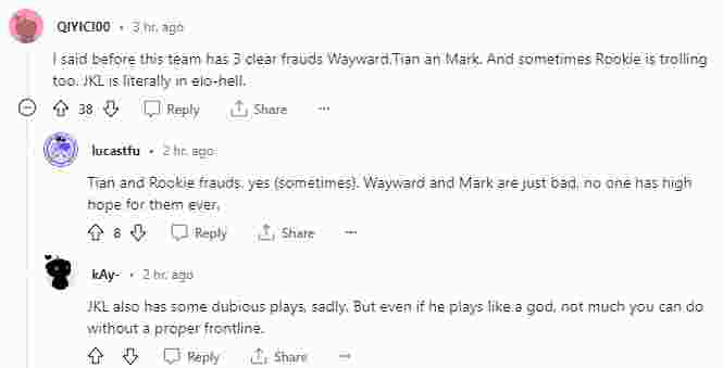 “TIAN和ROOKIE确实有时候不如预期,但是WAYWARD和MARK只是烂而已,没有人对他俩抱有很高的期待。”