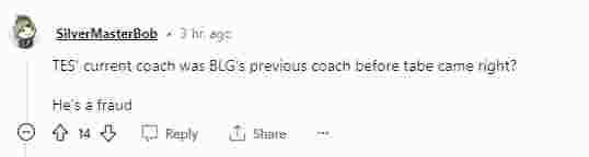 “TES现任的教练是BLG的前任教练对吧?他是个大骗子啊。”