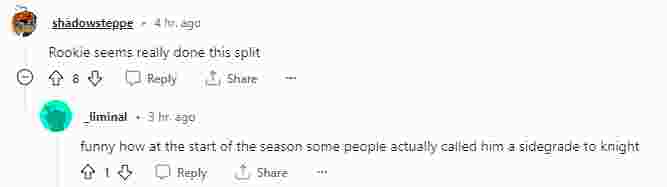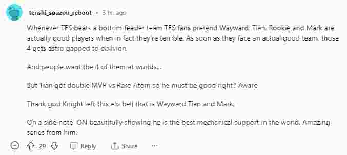 “每当TES击败垫底的队伍的时候,TES的粉丝都会假装WAYWARD、TIAN、ROOKIE和MARK是非常优秀的选手,但实际上他们很糟糕。一旦他们面对真正的强队,这四个人就会被打出巨大的对位差距。甚至人们还希望他们四个能去打世界赛。但是TIAN在对阵RA的时候收获了两个MVP,所以他一定很强吧?感谢上帝,让KNIGHT离开了这个由WAYWARD、TIAN和MARK组成的地狱。顺便说一句,ON华丽地展现了他是世界上最好的开团型辅助。他打出了一个精彩的系列赛。”