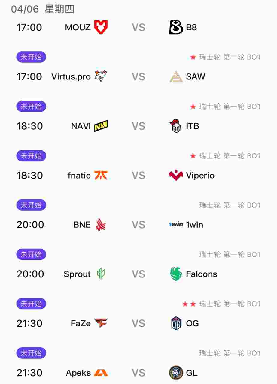 赛程速览:VP队标回归,前面一排基本都是熟面孔热门战队。Apeks战队近期在CCT西欧2:0战胜了BIG,1win战队拥有胖球、deko等明星选手,Falcons为法国追梦队,有Kennys等一众老将,GL则是上届欧洲RMR中的黑马,亲手将G2抬出Major的行列。