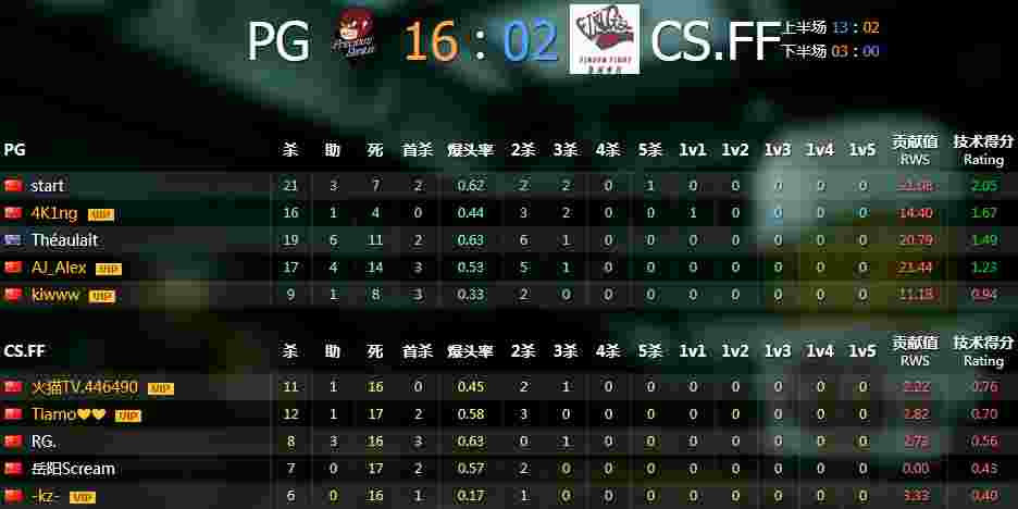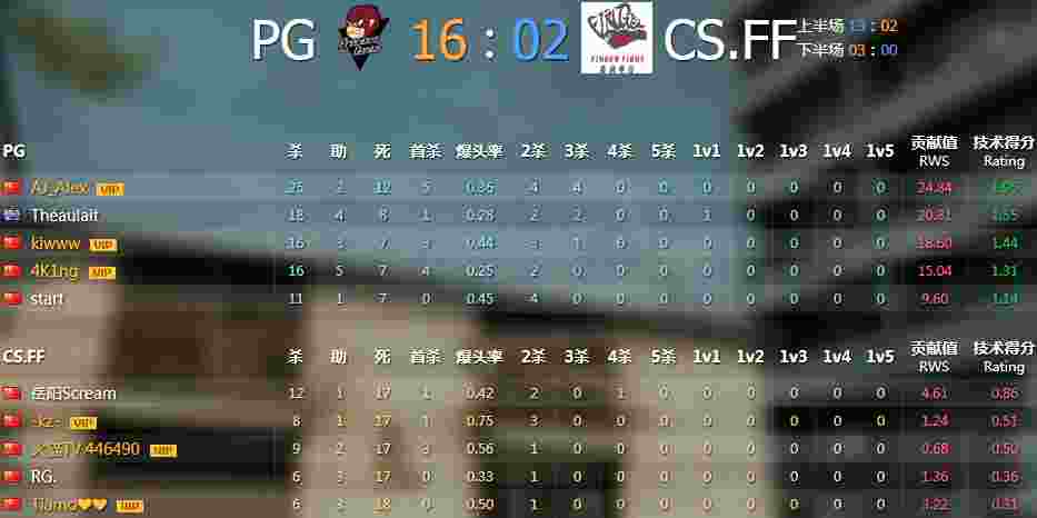 刀局选边,PG1V3拿下刀局选择了CT防守方,CS.FF为T进攻方。第一局手枪局PG的4K1ng手枪一个杀了三名T成功拿下第二局第1分。第2和第3局都被PG漂亮拿下,第4局PG的略微失误让CS.FF抓到机会拿下一局3:1,PG还是一路领先在上半场结束比分达到了13:2,PG的start在第10局更是1V5拿到了五杀,下半场第一把手枪局PG直接强攻拿下,下半场PG连赢3把16:2成功晋级。