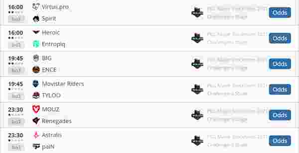 明日2-1的队伍的三场对阵分别是BIG vs ENCE、Heroic vs Entropiq以及Virtus.pro vs Spirit,1-2的队伍三场对阵为Astralis vs paiN、Riders vs TYLOO、MOUZ vs Renegades,有欧洲区的强强对抗,也有CIS地区的内战,最让我们国内玩家关注的还要属TYLOO对阵Riders的比赛,西班牙战队此前的战绩分别是16-13战胜了Renegades,12-16输给了VP和Entropiq。除此以外还有dexter面对老东家Renegades,后者在本届Major的表现不如IEM科隆中亮眼。